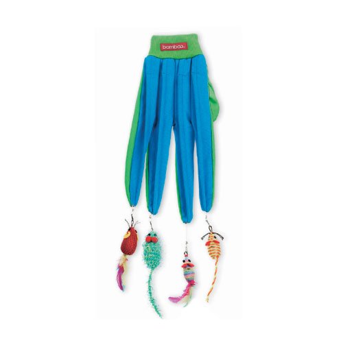 Comfortable canvas glove protects hands from scratches and nips, while four detachable, catnip-scented mouse "lures" drive cats wild. Special elastic lines in each finger promote a "fishing frenzy" as cats tug and pull each lure up to 12 inches.