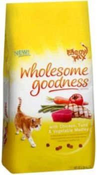 Meow Mix® Wholesome Goodness® Indoor Cat Formula Dry Cat Food Cat ask for it by name. Delicious and nutritious, packed with wholesome grains, proteins and other high quality ingredients, Meow Mix is 100% nutritionally balanced. Meow Mix will offer your cat complete and balanced nutrition for strong bones, healthy teeth, a shiny coat and lots of energy. Meow Mix Wholesome Goodness is free of artificial colors and preservatives, so you can rest assured your kitty is getting the nutrients he needs for a healthy life. Features: · Calcium and phosphorous for strong bones and teeth · Enriched with vitamins and minerals · Easy to chew small pellet size kibble · Vitamin A for healthy eyes · Balanced nutrition for a healthy indoor cat · Made with real meats and vegetables Item Specifications: Size: 6 lb 14.2 lb Style: Chicken, Tuna and Vegetable Medley Ingredients: Ground yellow corn, chicken meal, soybean meal, beef tallow preserved with mixed tocopherols, chicken, tuna, brewers rice, barley, green beans, carrots, calcium carbonate, potassium chloride, alfalfa nutrient concentrate, salt, phosphoric acid, choline chloride, tomato powder, beet powder, vitamins (vitamin e supplement, niacin supplement, vitamin a supplement, d-calcium pantothenate, thiamine mononitrate (source of vitamin b1), riboflavin supplement (source of vitamin b2), pyridoxine hydrochloride (source of vitamin b6), menadione sodium bisulfite complex (source of vitamin k activity), vitamin d3 supplement, folic acid, biotin, vitamin b12 supplement), minerals (ferrous sulfate (source of iron), zinc oxide, manganous oxide, copper sulfate, calcium iodate, sodium selenite), taurine, mixed tocopherols. Guaranteed Analysis: Crude Protein (min) 31.0% Crude Fat (min) 12.0% Crude Fiber (max) 3.0% Moisture (max) 12.0% Calcium (Ca) (min) 1.0% Phosphorus (P) (min) 0.8%w