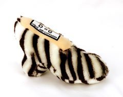 Zebra styled "Dolce and Grrbanana" shoe-shaped dog chew toy. Keep your dog(s) away from the real thing! Available in two sizes. Small: 5" Large:8" Disclaimer: Product of HDD not affiliated with Dolce & Gabanna.